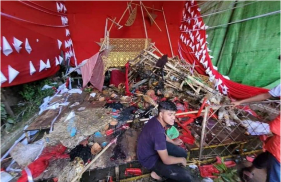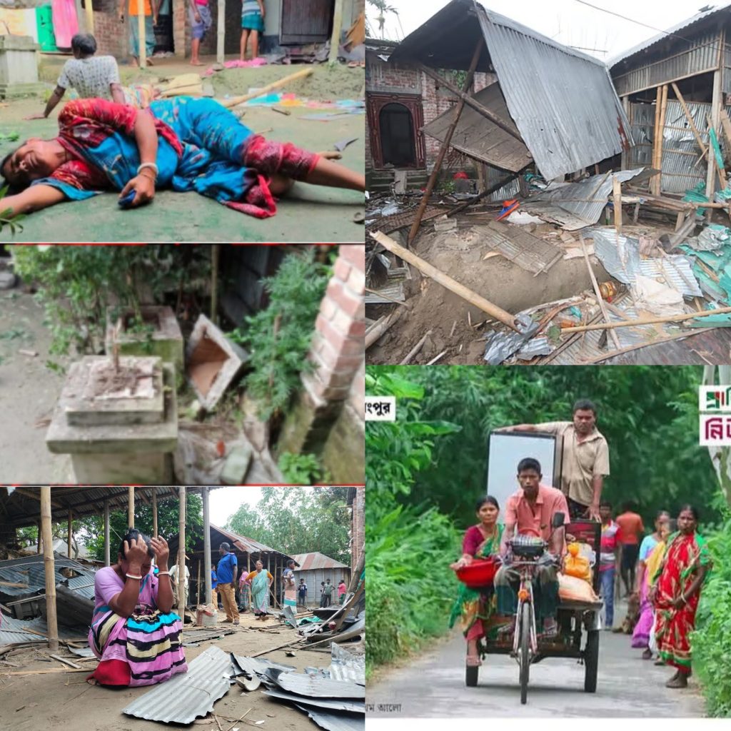 At least 20 Hindu families in Betgari Union, Gangachara Upazila of Rangpur District, were left homeless and destitute after three days of targeted communal violence triggered by a blasphemy allegation against an 18-year-old Hindu youth. The attacks, marked by looting, arson and religious desecration, led to the displacement of over 50 Hindu families. At least three shops owned by Hindus, along with several Tulsi Manchas (sacred brick altars traditionally used in Hindu households for worshiping the Tulsi plant)—were also vandalized.
