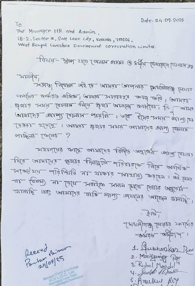 Hindu Voice Team: Serious allegations of discrimination against Hindu employees have surfaced at the state-run West Bengal Livestock Development Corporation Limited (WBLDC), Coochbehar. On September 24, 2025, a group of workers from the Mekhliganj farm submitted a written complaint, clearly stating that they are being treated unfairly at the workplace on the basis of religion.