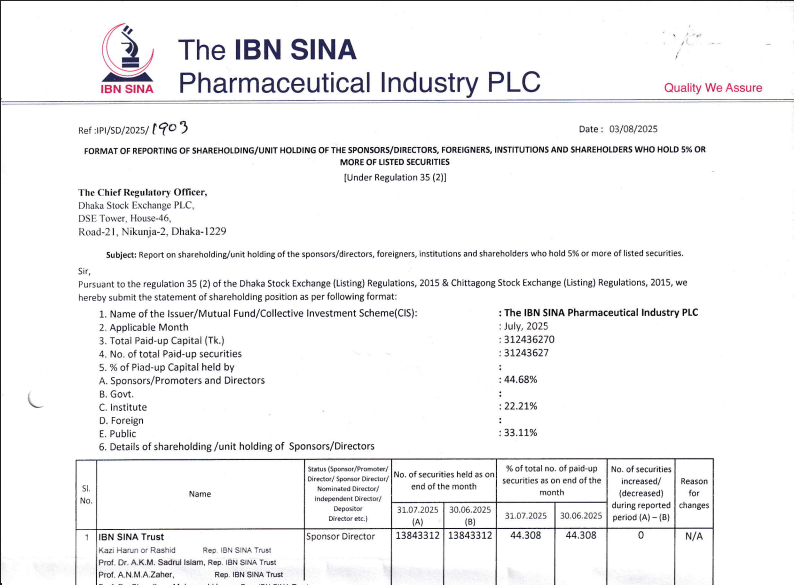 According to the company’s shareholding report (July 2025), the trust and its directors control 44.68% of IBN SINA, ensuring ongoing influence over corporate governance and operational policies.