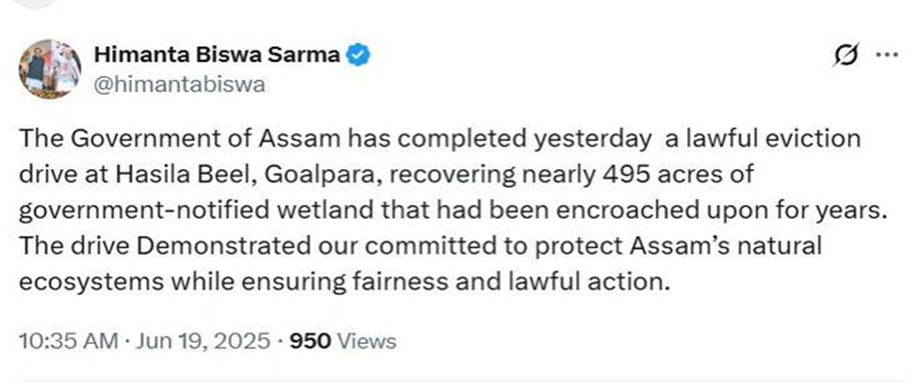 On the early morning of June 16, a large-scale eviction operation was carried out at Hahila Beel, a well-known wetland in Assam’s Goalpara district, which is even larger than the ecologically important Deepor Beel near Guwahati. The eviction, supported by heavy security, was carried out as per legal procedures. Three eviction notices had been issued to the occupants prior to the operation – one each in 2023, 2024, and most recently on June 14. Public announcements were also made via banners and loudspeakers, asking them to vacate the land by June 15. The administration stated that around 20-25 families vacated voluntarily after the latest notice. The operation was aimed at clearing illegal encroachments on nearly 1,500 bighas of Government land, including households, five Lower Primary schools, and a Jal Jeevan Mission Project.